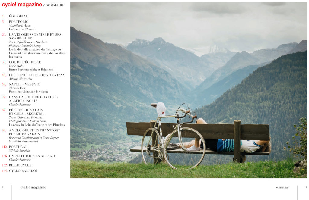 Contenu: Portfolio Le Tour de l’Avenir; La Vélobuissonnière et ses savoir-faire, De la dentelle à l’acier, du fromage au crémant, un itinéraire qui a de l’or dans les mains; Col de l’Échelle, Entre Bardonecchia et Briançon; Les Bicyclettes de Stolvizza; Napoli-Vesuvio, Première visite sur le volcan; Dans la roue de Charles-Albert Cingria; Pépites du Valais et cols « secrets », Les Cols du Lein, du Tronc, et des Planches; A vélo-ski et en transport public en Valais, Mobilité, doucement; Portugal; Un petit tour en Albanie; Cyclo Balado!; bibliocycle!.